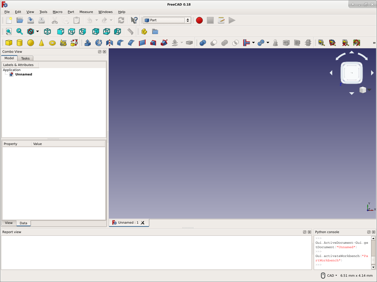 brew install freecadA interface do FreeCAD é dividida em bancadas. Bancadas são conjuntos de ferramentas agrupadas por tipo de uso. Por exemplo, a bancada Sketcher oferece ferramentas de desenho 2D com restrições, as bancadas Part e PartDesign ferramentas para criar peças 3D inteira, a bancada Path para gerar caminhos de corte para máquinas CNC, etc. Você pode trocar a bancada a qualquer momento, e continuar a trabalhar no mesmo modelo. Também pode criar bancadas personalizadas com suas ferramentas favoritas de outras bancadas.