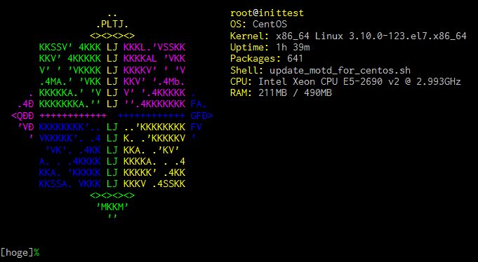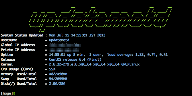 /etc/motdにサーバ情報を書き込むスクリプト。cronとかで回しておくと便利。#Ubuntu(http://manpages.ubuntu.com/manpages/lucid/man5/update-motd.5.html) やAmazonLinuxみたいなupdate-motdがCentOSにも欲しい。