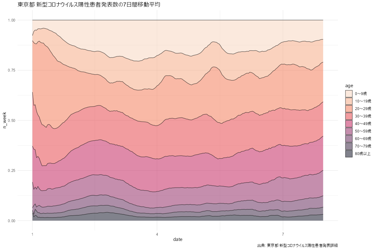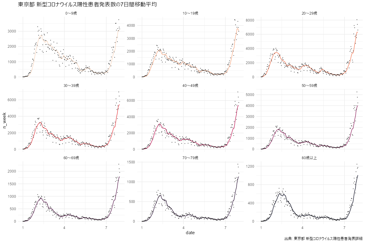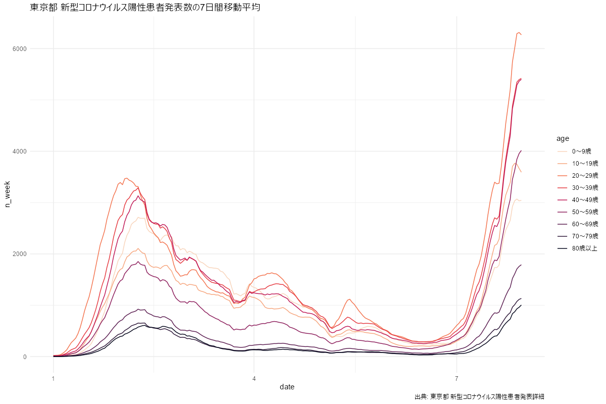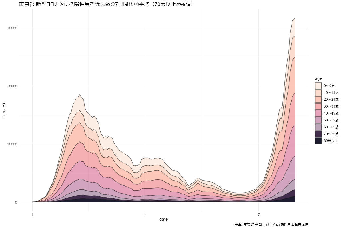 title = "東京都 新型コロナウイルス陽性患者発表数の7日間移動平均(70歳以上を強調)",