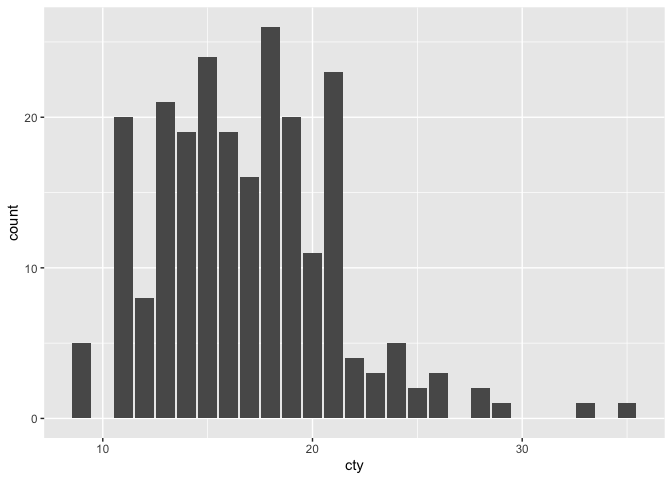#> ggplot(mpg, aes(cty)) + geom_bar()