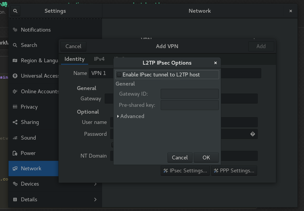 nmcli c down {vpn_name} # close the vpn connectionGatewayis the ip of the vpn serverUser nameis the given user- Password can be left blank to enter when connecting