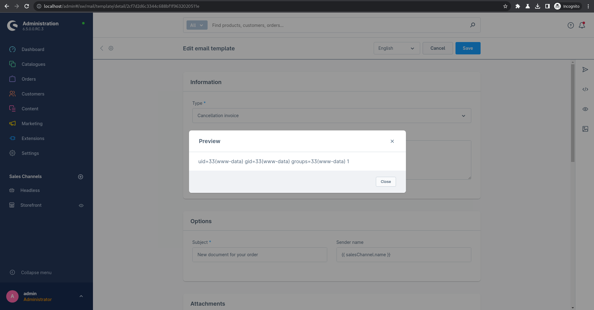 For simplicity, the following proof-of-concept uses the administrator account to demonstrate how the vulnerability can be exploited using Email templates.