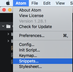 In Atom, you can add snippets by going to the Atom menu and going to Snippets...