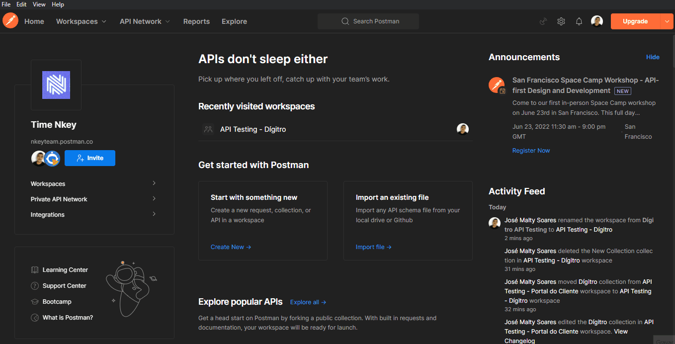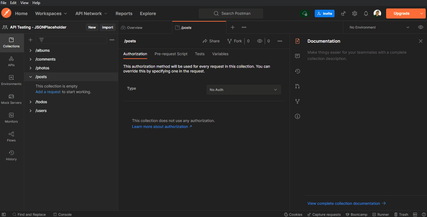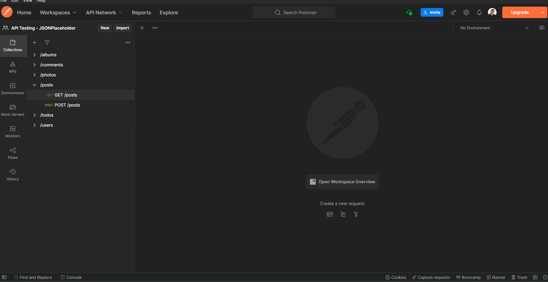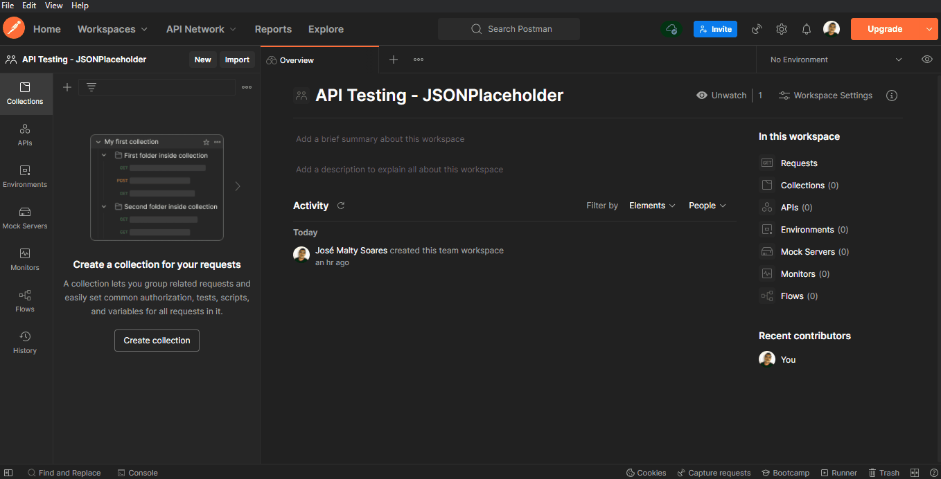 No nosso caso, criei o Workspace "API Testing - JSONPlaceholder":