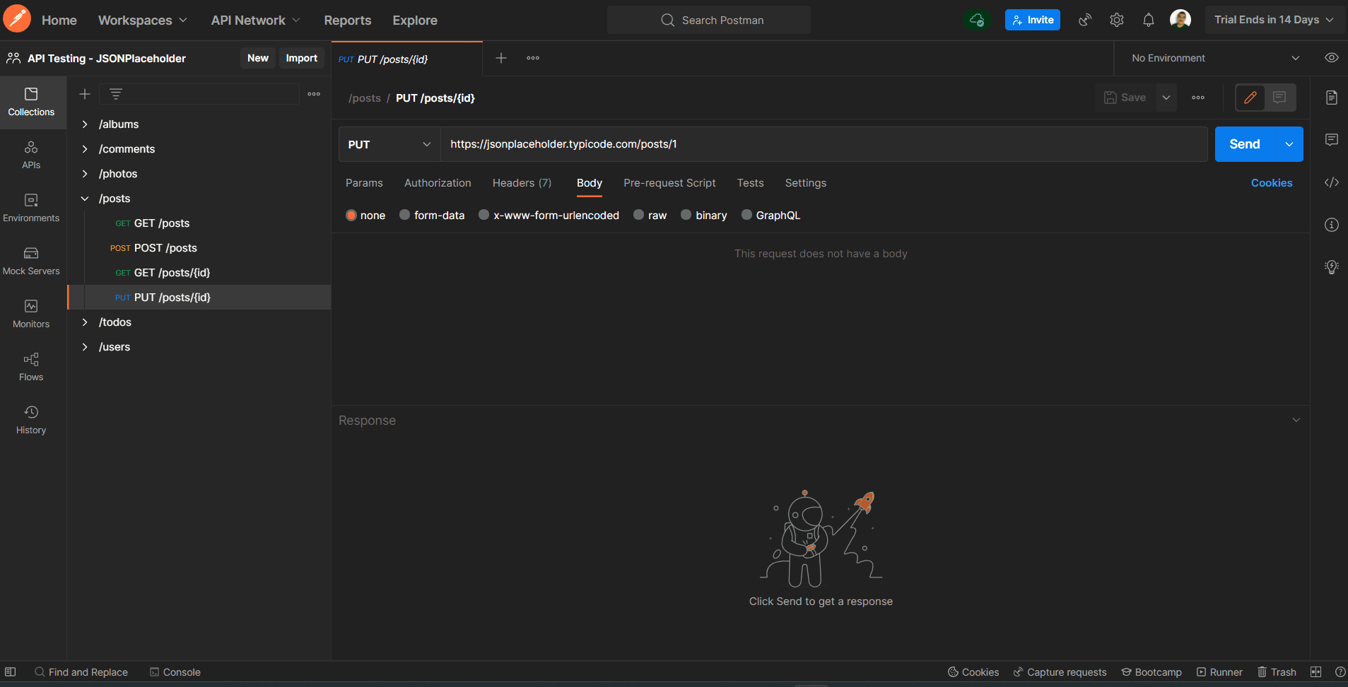 Para atualizar uma variável de ambiente assimilando determinado conteúdo do corpo da resposta da requisição, é primeiro interessante saber que os testes no Postman, que podem ser feitos através do JavaScript embutido no software, só irão ser executados após a requisição ter sido concluída. Desta forma, vamos à prática!