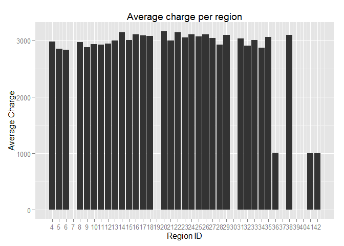 ggplot(data=avg.region,aes(x=region,y=average_charge))+geom_histogram(stat="identity")+scale_x_continuous(breaks=seq(min(avg.region$region),max(avg.region$region),1))+xlab("Region ID")+ylab("Average Charge")+ggtitle("Average charge per region")avg.overall## avg(hourly_charge)
