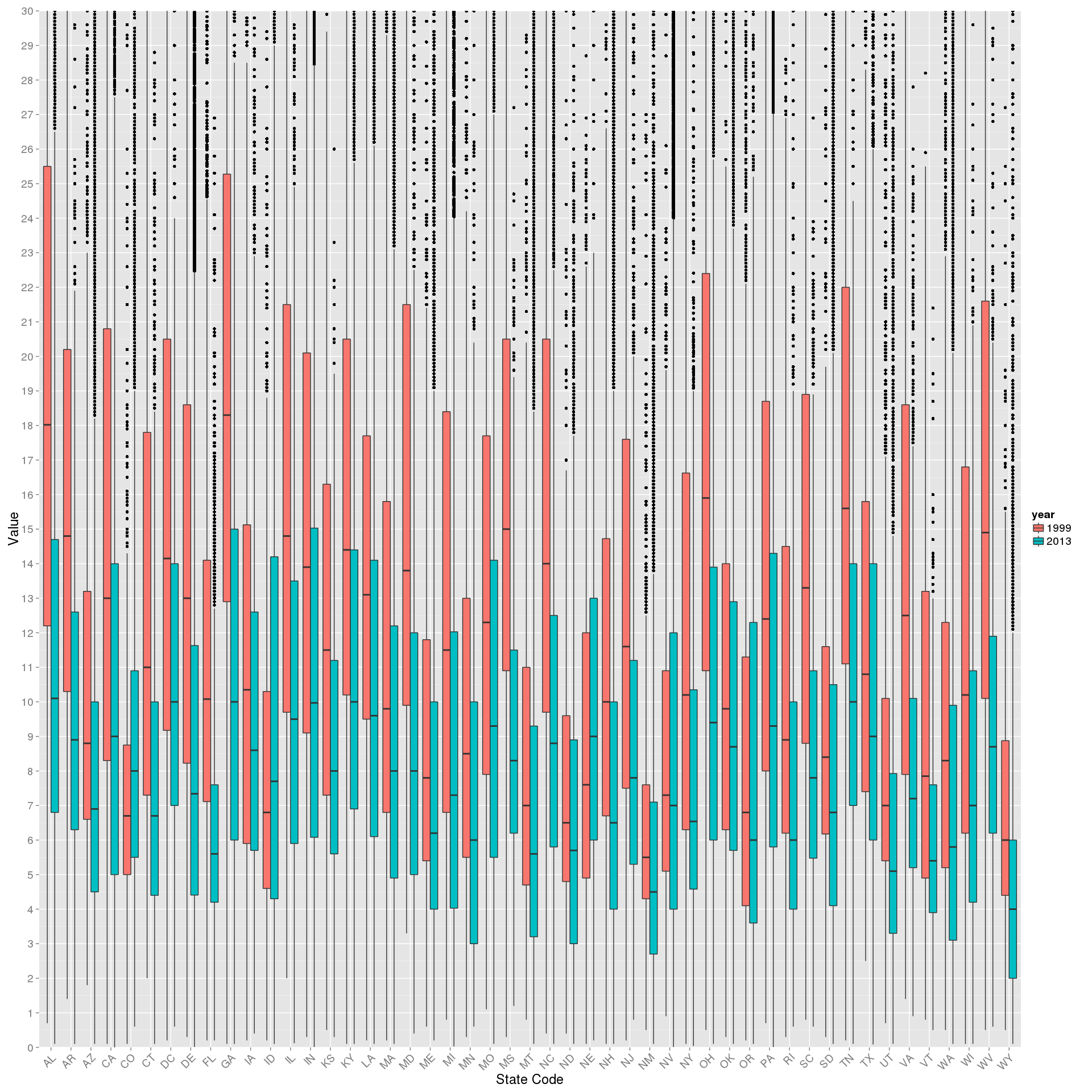 ggplot(data=temp.all,aes(x=State.Code,y=Sample.Value,fill=year))+geom_boxplot()+scale_y_continuous(breaks=seq(0,30,1))+coord_cartesian(ylim = c(0,30))+ylab("Value")+xlab("State Code")+theme(text=element_text(size = 18),axis.text.x = element_text(angle = 45, hjust = 1))