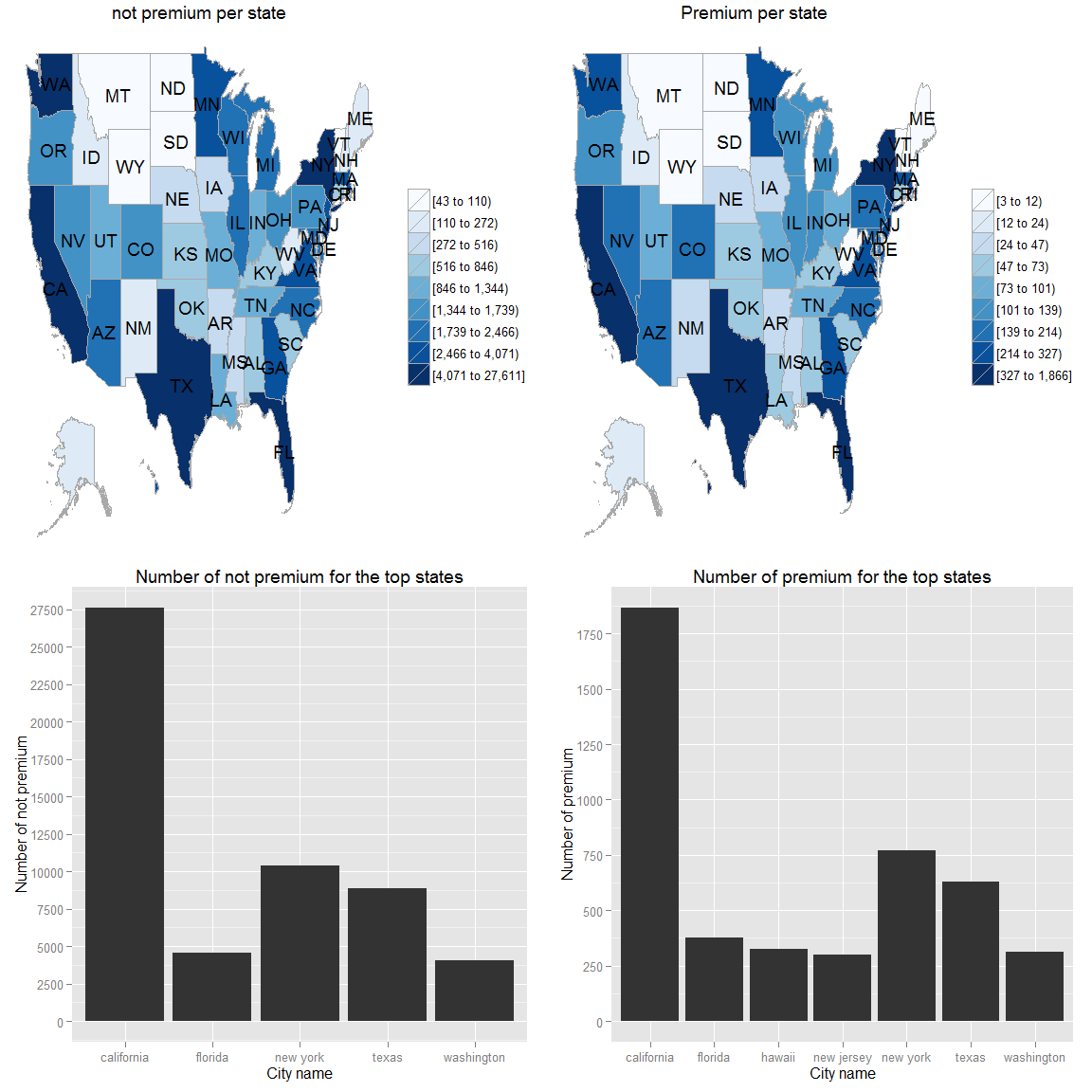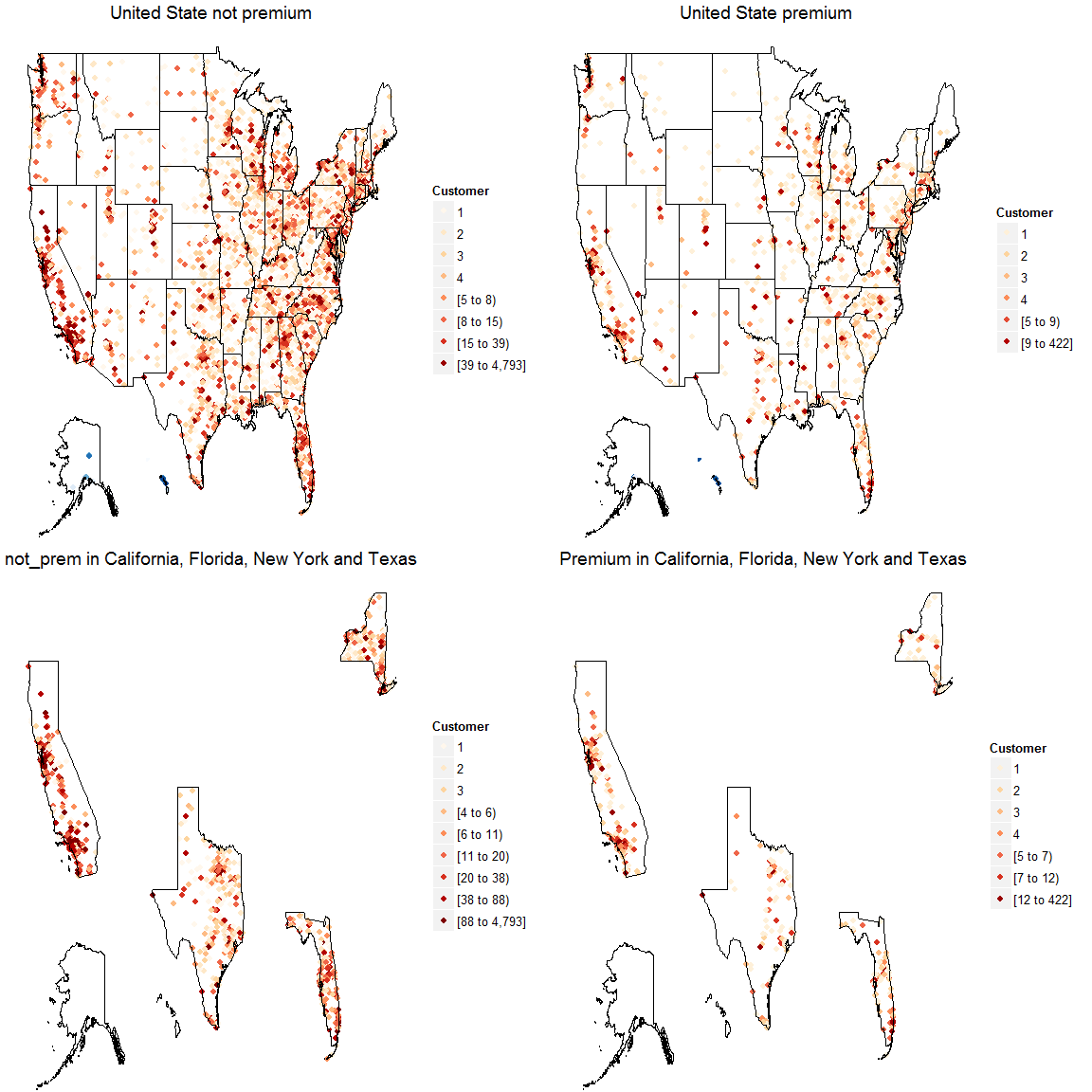 g.zip.not_prem.focus<-zip_map(ds.zipmap.not_prem,buckets=9,zoom = c("california","florida","new york","texas"))+ggtitle("not_prem in California, Florida, New York and Texas")+scale_color_brewer(name="Customer", palette=8)## Scale for 'colour' is already present. Adding another scale for 'colour', which will replace the existing scale.