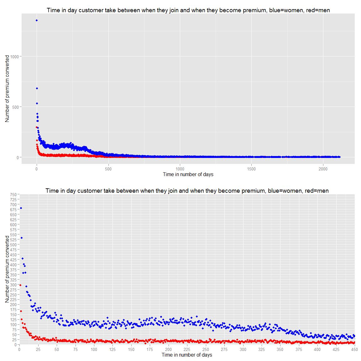 g.prem.joined<-ggplot(data=ds.prem.joined.wide,aes(x=premium_join_delay, y=(M)))+geom_point(color="red")+geom_point(data=ds.prem.joined.wide,aes(x=premium_join_delay, y=F),color="blue")+ggtitle("Time in day customer take between when they join and when they become premium, blue=women, red=men")+xlab("Time in number of days")+ylab("Number of premium converted")