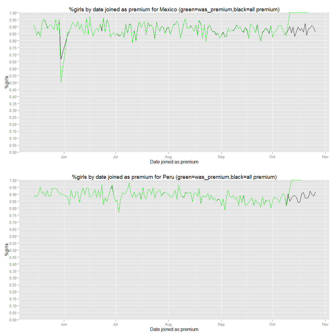 g.fc_gender.noprem+geom_line(data=ds.age.fc_gender.prem.wide,aes(x=age,y=percentF),colour="red")+geom_line(data=ds.age.fc_gender.nopremanymore.wide,aes(x=age,y=percentF),colour="green")+ggtitle("%girls by age (red=premium,green=was_premium,black=not premium)")We can see that in proportion we have more girl than guys that are premium than not. Moreover, girls tend to convert more than guy especially when they get older. Therefore, girls who try our product are more likely to become premium members. Finally, we can see that there are more boy than girls that join our website as they get older. An assumption could be that they do register for their kid and the male do it as (regretfully) male still have the more income than women in average in couple (at least in Europe: http://www.theguardian.com/world/2014/mar/06/french-married-women-earn-less-male-partners).
