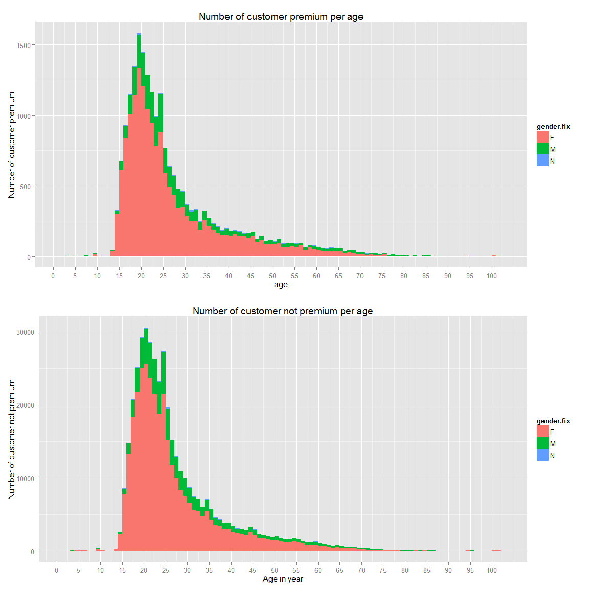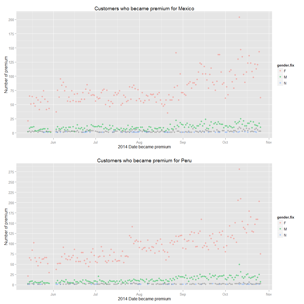 ds.prem.joined <- ds %>% filter(premium_join_delay>0,!is.na(gender.fix)) %>% group_by(premium_join_delay,gender.fix) %>% summarise(n=n()) %>% ungroup() %>% arrange(premium_join_delay)