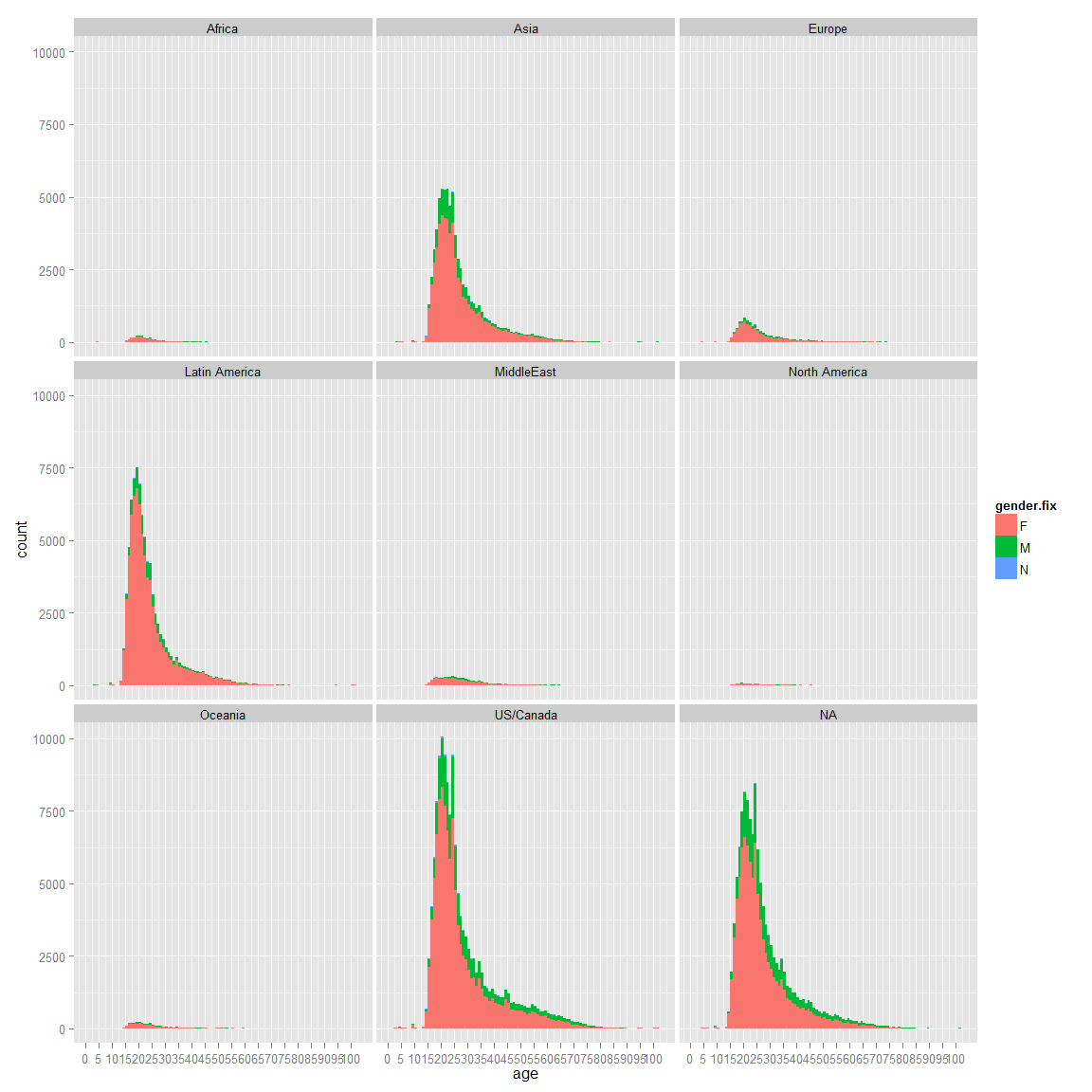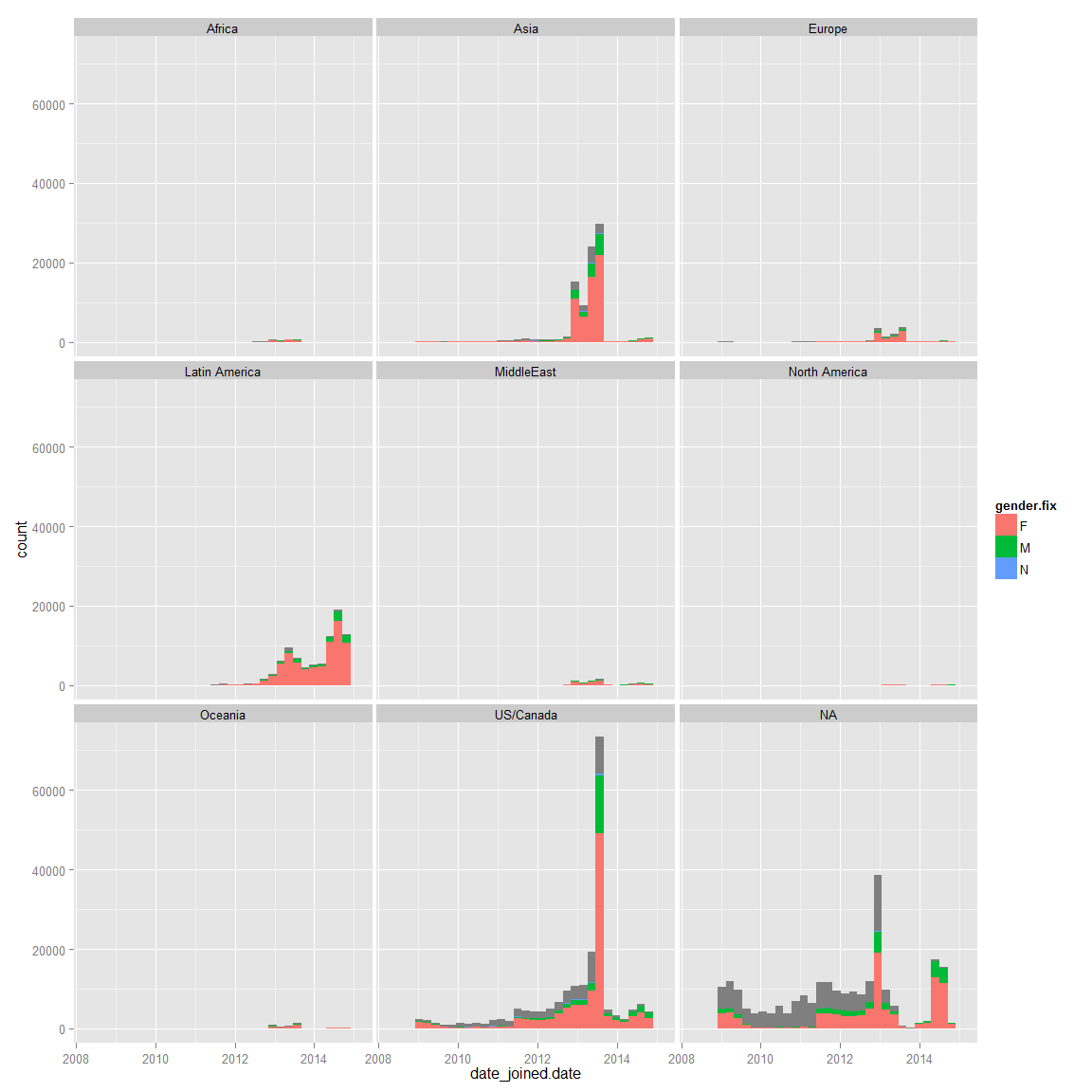 ggplot(data=ds,aes(x=date_joined.date,fill=gender.fix))+geom_histogram()+facet_wrap(~region_id) ## stat_bin: binwidth defaulted to range/30. Use 'binwidth = x' to adjust this.