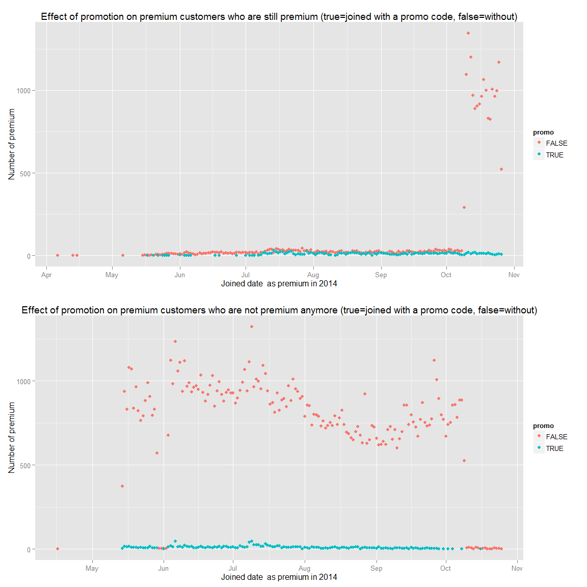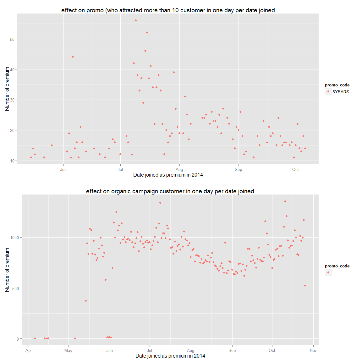 grid.arrange(g.prem.joined,g.prem.joined.zoom,ncol=1)We can see that they become premium in the first year and the more we wait the more unlikely they become premium. Therefore, we should focus our advertising to new user extensively.