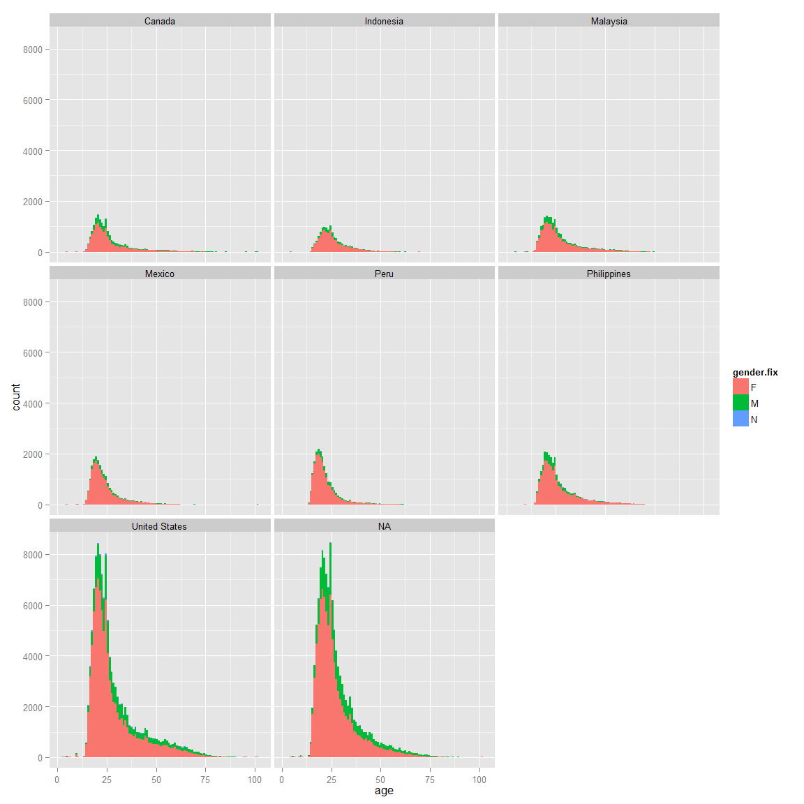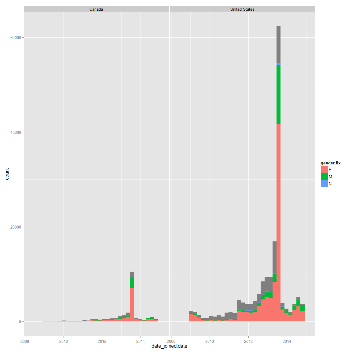 ggplot(data=filter(ds,country_id=="United States" | country_id=="Canada" ),aes(x=date_joined.date,fill=gender.fix))+geom_histogram()+facet_wrap(~country_id)## stat_bin: binwidth defaulted to range/30. Use 'binwidth = x' to adjust this.