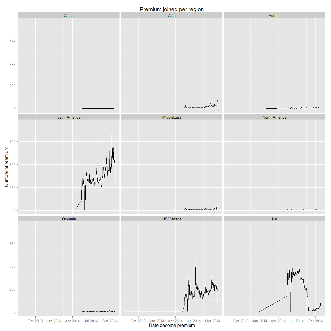 ds<-mutate(ds,premium_join_delay=as.numeric(premium_since.date-date_joined.date))ds.fc_by_date_region<- ds %>% filter(!is.na(premium_since.date)) %>% group_by(premium_since.date,region_id) %>% summarise(n=n()) %>% ungroup() %>% arrange(premium_since.date)