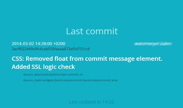 The Jenkins Last Commit widget periodically fetches SCM change information from a Jenkins instance for a specified list of jobs.
