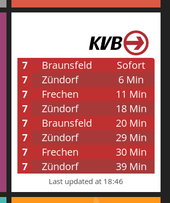 Subway Info is a Dashing widget which displays information on trains in New York City. Information includes train line, direction, station and arrival time. You can customize it to include any combination of lines and stations. This may also be used in other cities as well if you have the appropriate GTFS files.