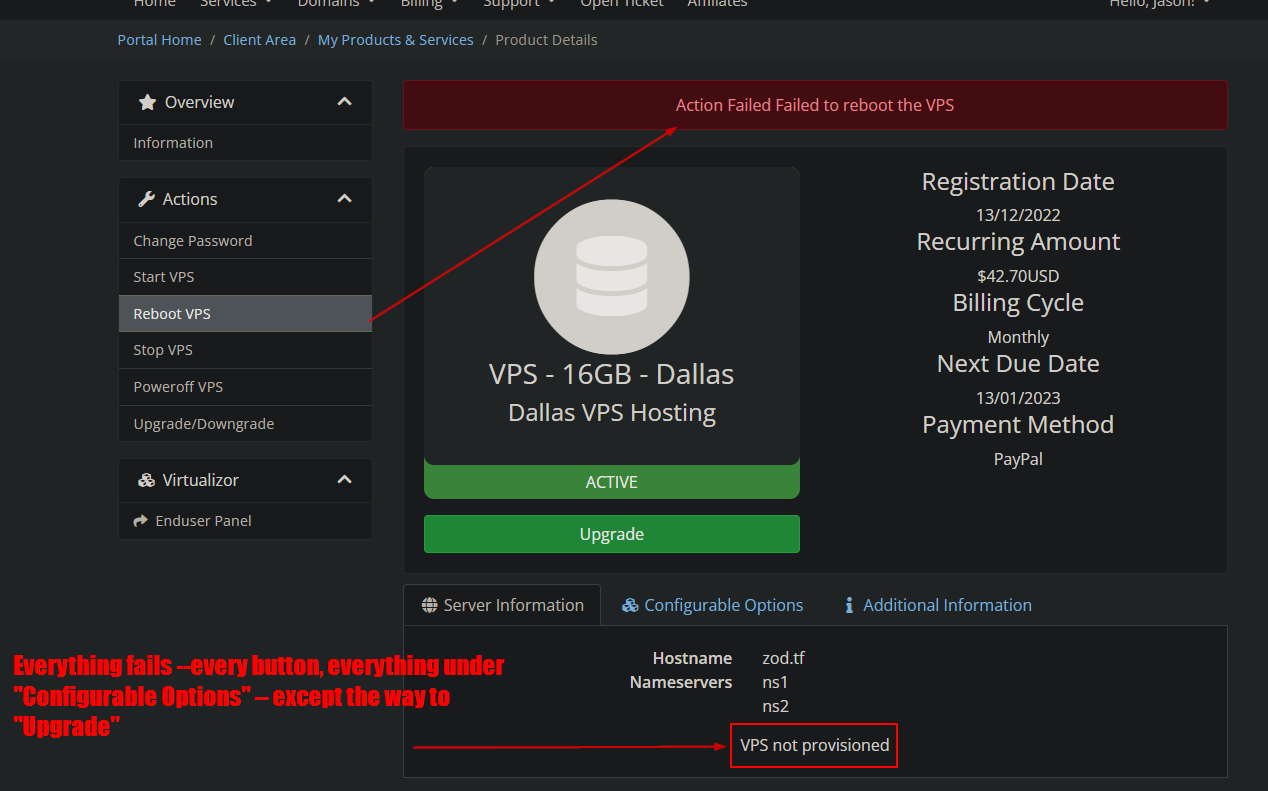 The client area however is what really hurts the score here, as it is -- I kid you not -- completely non-functional. My host listed on screen was not at all verified before it was set in stone (obviously I own it, but the lack of due diligence...). My nameservers were set by the creation form which only asked for a "Nameserver Prefix", but now my name servers have since displayed the nonsensical "ns1" and "ns2" as their values. No button to interact with the VPS system works. At all. No rebooting, no starting, no gathering crash reports or output logs: forget that. Just make a support ticket and wait for an unsatisfying answer which only answers one of the four questions you asked.